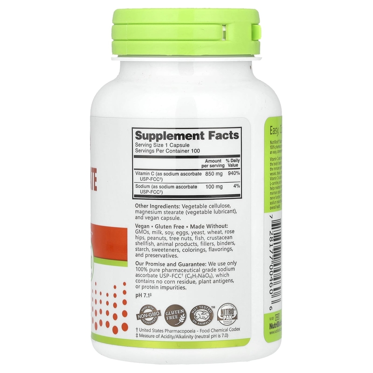 Капсулы с аскорбатом натрия NutriBiotic® содержат 850 мг 100% витамина C фармацевтической степени чистоты и 100 мг натрия в простой и удобной форме.