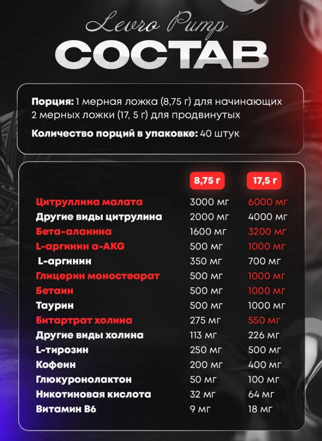 LevroPUMP — это совершенный препарат для использования перед тренировкой, в состав которого входят тщательно подобранные и проверенные ингредиенты, стимулирующие организм к максимальным спортивным результатам и создающие потрясающий эффект «накачки мышц» (пампинг). Рекомендован взрослым атлетам в периоды наиболее интенсивных, длительных тренировок на выносливость и силовую подготовку. Каждая порция содержит 4000 мг бета-аланина (CarnoSyn®), 2000 мг аргинина альфа-кетоглутарата, 1000 мг агматин сульфата, 1500 мг цитруллина малата и 1000 мг таурина.